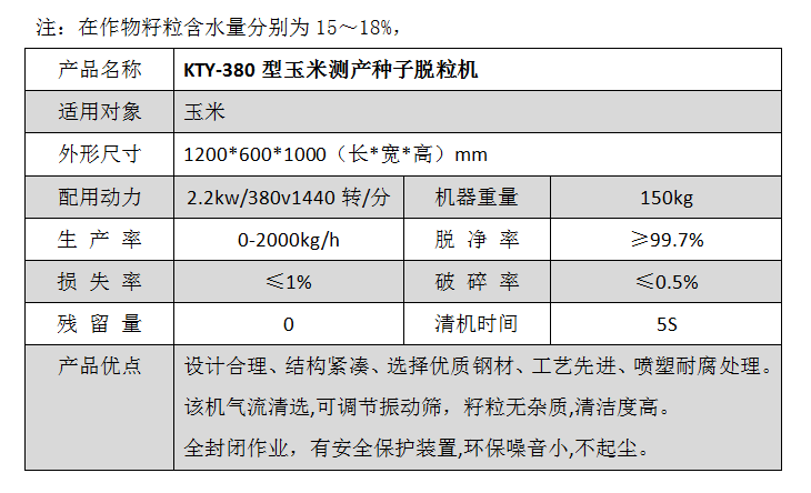 KTY-380型玉米測產種子脫粒機技術規格及性能指標:
